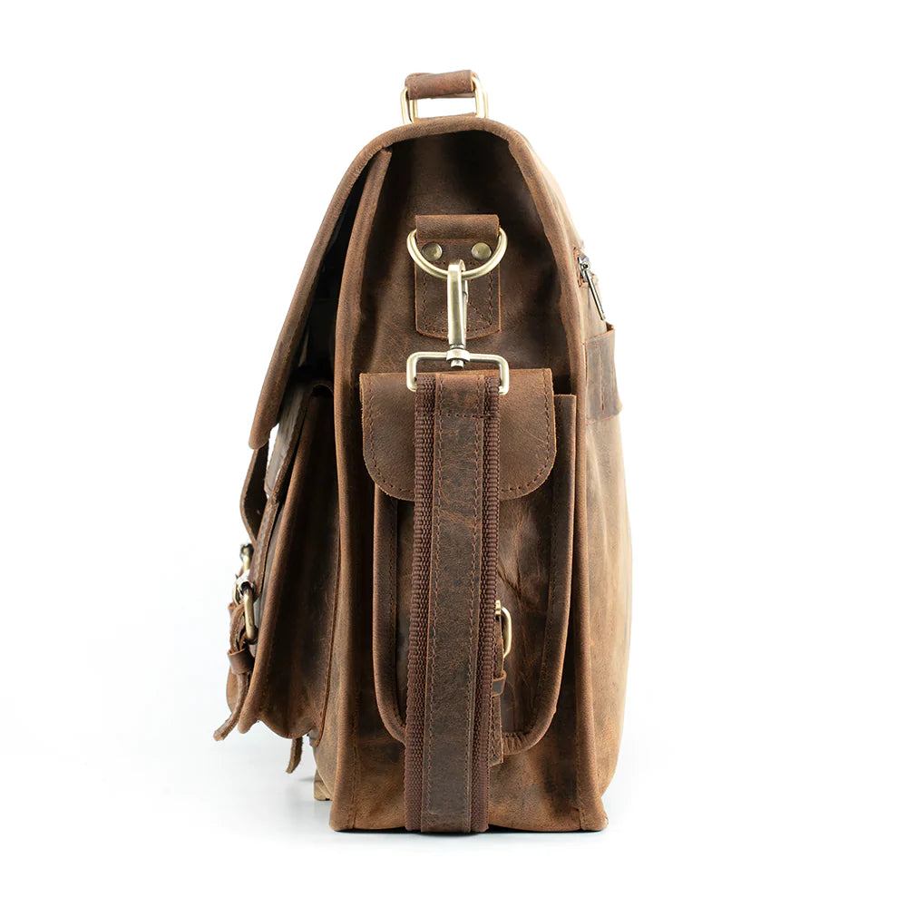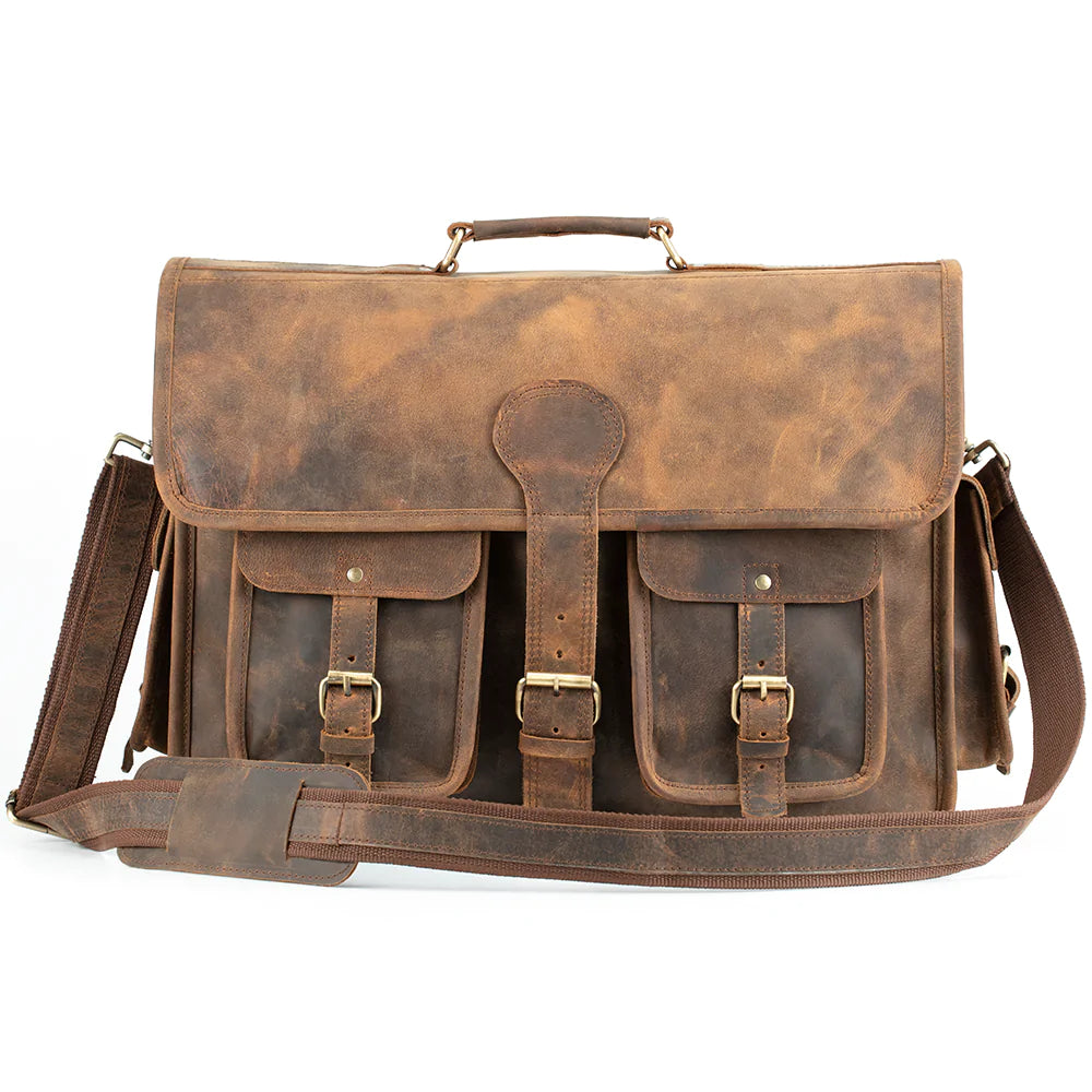 This vintage style brown buffalo leather briefcase for men is made from full grain buffalo leather and will complement any outfit for any occasion! This timeless bag is available in two different sizes and comes with an adjustable and removable shoulder strap.