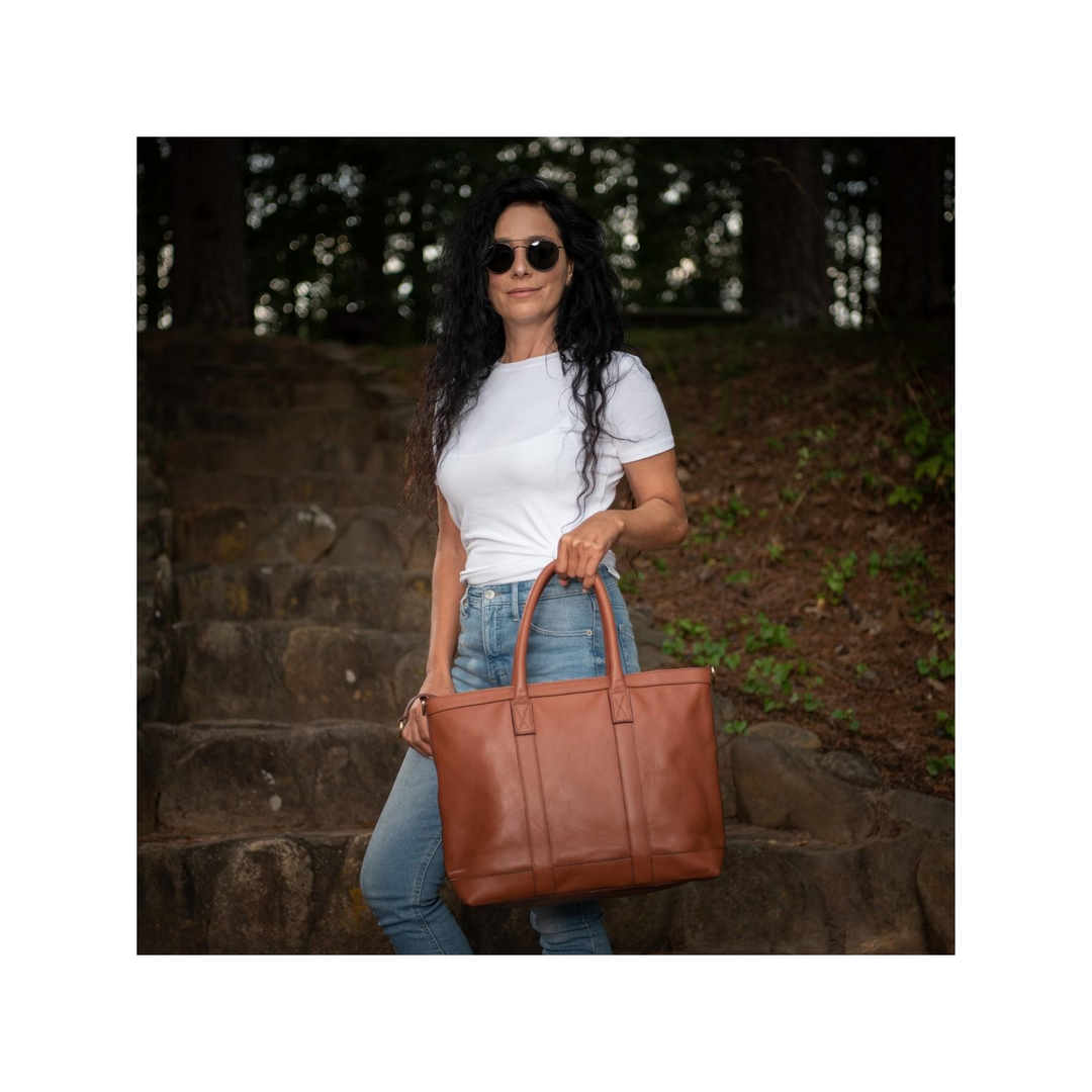 Spruce up your wardrobe with this practical leather tote bag, especially designed with a woman’s busy lifestyle in mind. The luxurious camel colored leather is durable and stylish. A top zipper closure keeps contents organized and solidly stowed away for additional peace of mind while traveling or commuting. It’s easy to stand out from the crowd in this fashionable and functional leather tote bag!