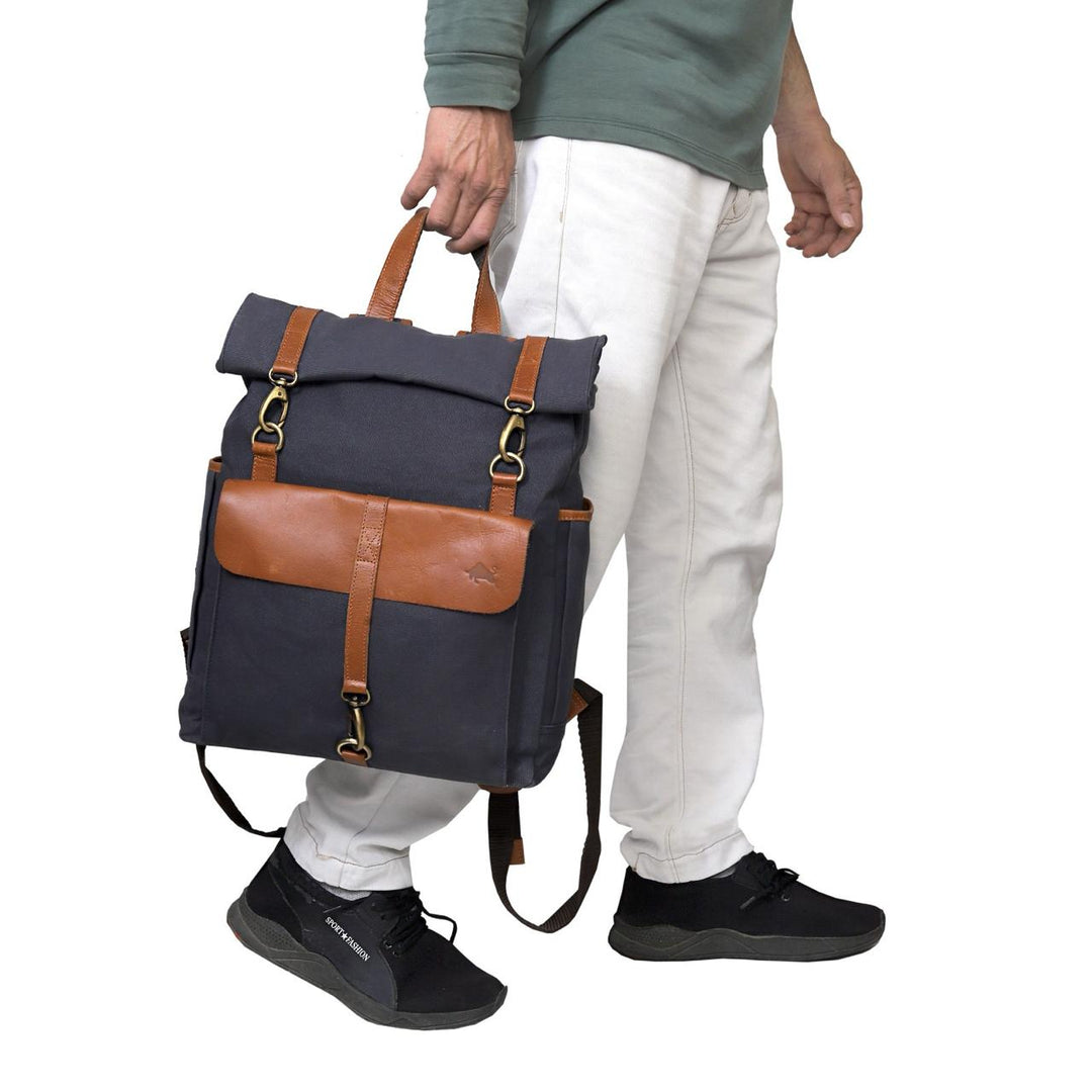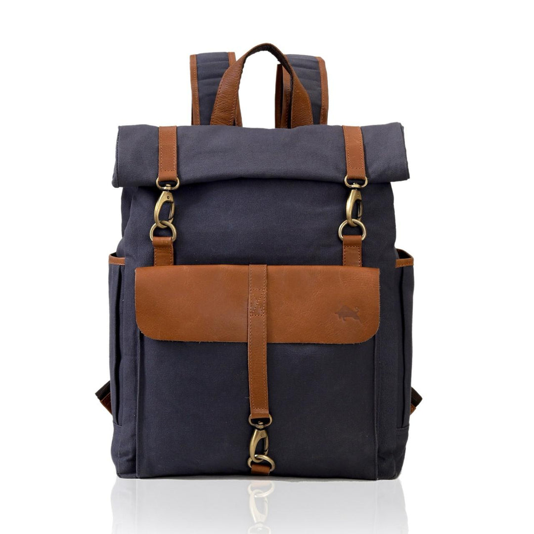 Explore the world with the Drake Buffalo Leather Backpack. Made of sturdy buffalo leather and durable navy canvas, this backpack is perfect for any adventure. The secure clip closures will keep your belongings safe while you roam. Invest in a backpack that will last and enhance your travels!
