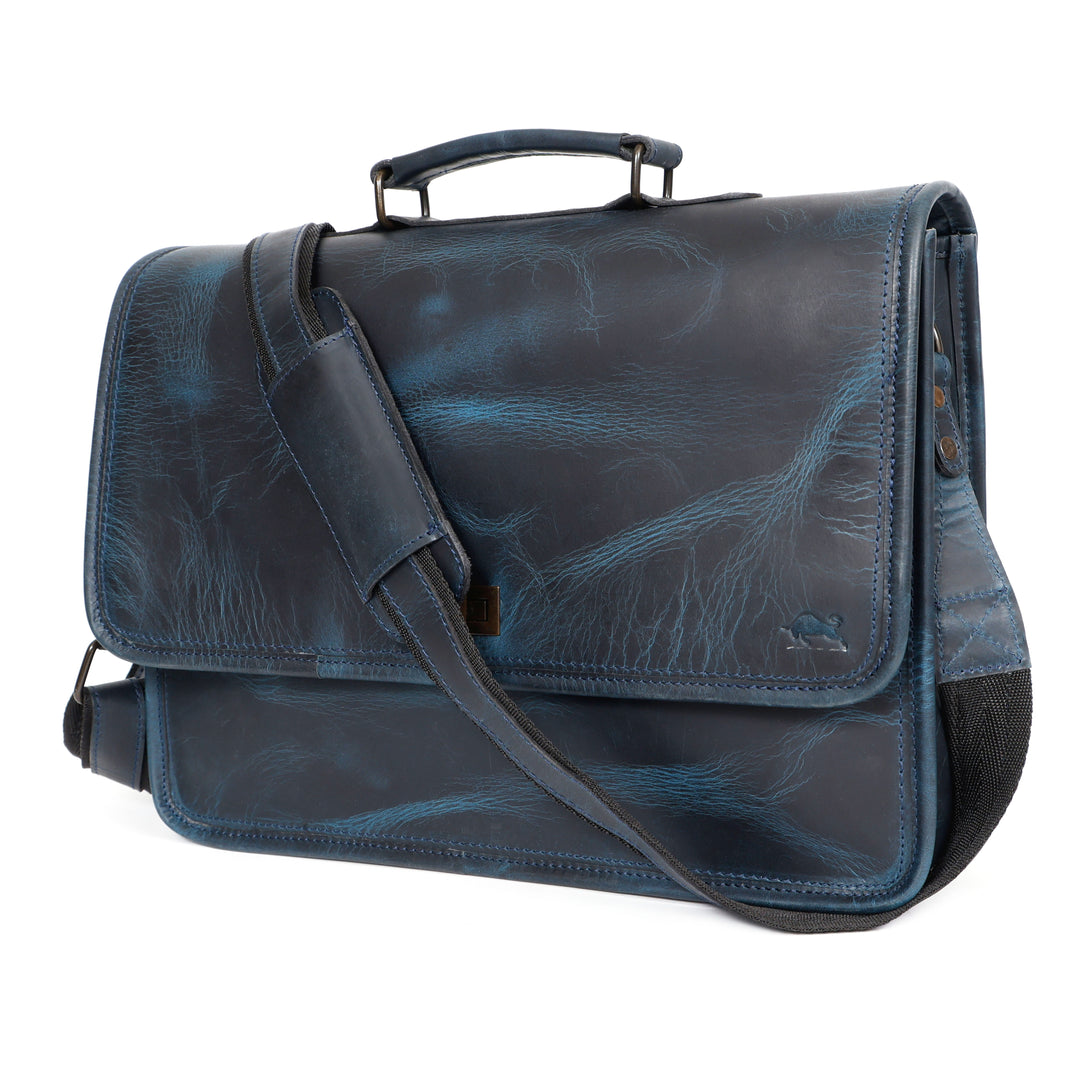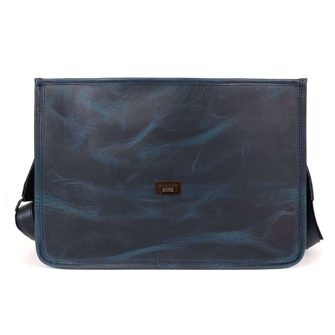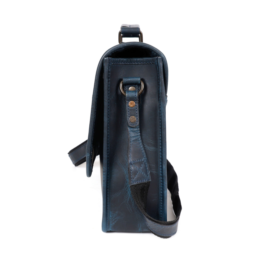The Parker blue messenger bag showcases authentic full grain water buffalo leather in a rich blue finish. Each piece displays natural variations in tone and texture, a hallmark of genuine leather that ensures no two bags are identical. These subtle differences enhance the bag’s character, revealing the material’s organic beauty and craftsmanship while developing a distinctive patina with age.
