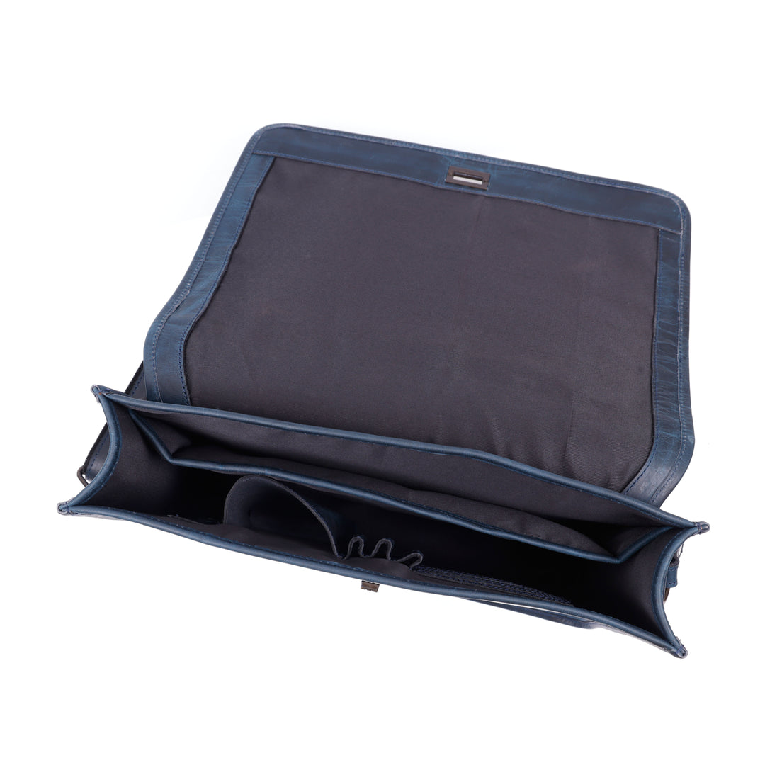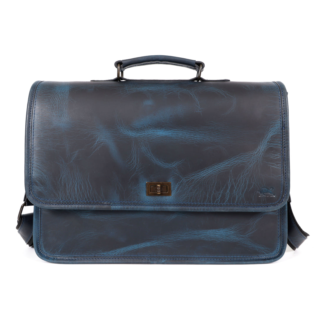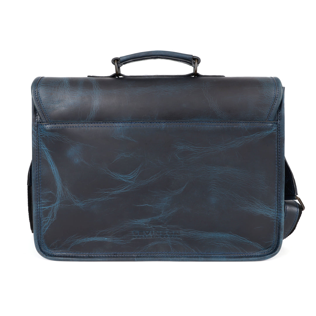 The Parker blue messenger bag showcases authentic full grain water buffalo leather in a rich blue finish. Each piece displays natural variations in tone and texture, a hallmark of genuine leather that ensures no two bags are identical. These subtle differences enhance the bag’s character, revealing the material’s organic beauty and craftsmanship while developing a distinctive patina with age.