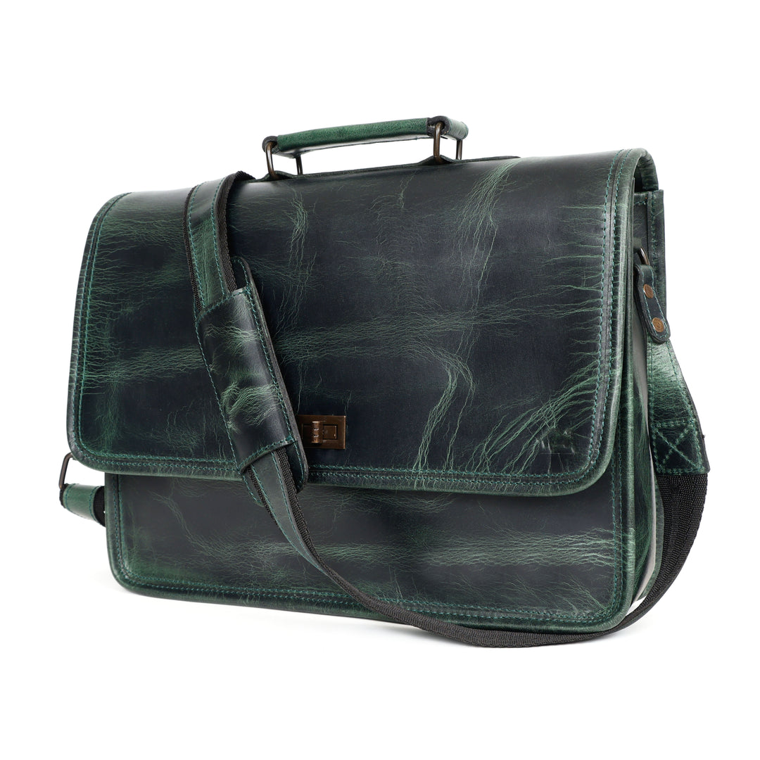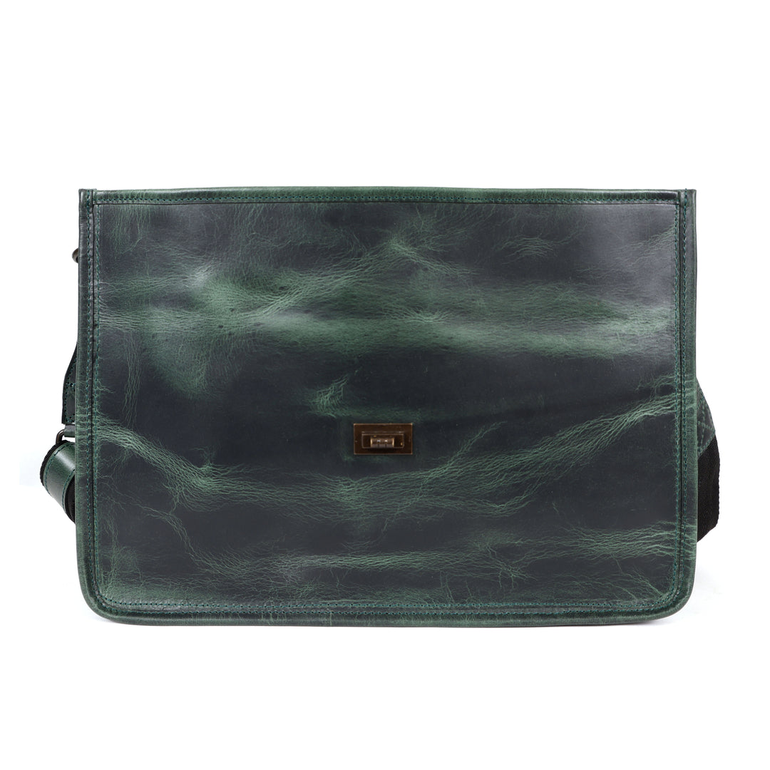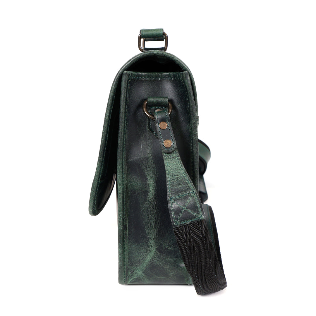 The Parker green messenger bag showcases authentic full grain water buffalo leather in a rich green finish. Each piece displays natural variations in tone and texture, a hallmark of genuine leather that ensures no two bags are identical. These subtle differences enhance the bag’s character, revealing the material’s organic beauty and craftsmanship while developing a distinctive patina with age.